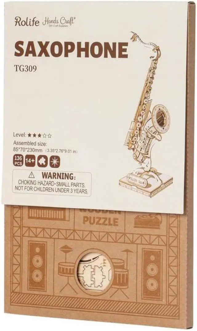 Enjoy long interactive hours of fun play with family and friends with this 3D DIY Wooden Puzzle to recreate a beautiful saxophone! With all tools and glue included, this has a fun and unique design that serves as great home decor. This Wood Craft Kit engages your brain and hands, is a great activity to spend constructive time with family or friends as you can involve them in assembling the pieces and lends a great sense of accomplishment after successful assembly. Improve your own skills or help your loved ones improve their cognitive, motor, and emotional skills with this wood puzzle set that makes a great gift for Birthdays, Christmas, Back to School, boys, girls, friends, families, teachers, and more.