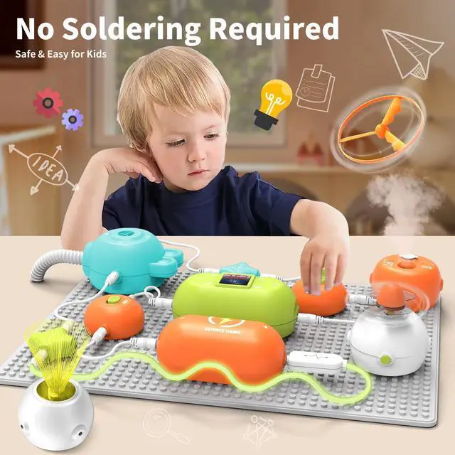 No Soldering & Tool-Free Setup All needed parts included (AA batteries NOT included). Simply insert circuits into the plastic boardeasy for toddlers and kids to build their own circuit machine.