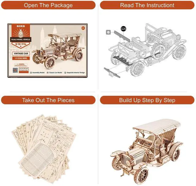 Inspried by the retro automobles and vehicles from the 19th century, ROKR Scale Model Vehicle consists of five exquiste replica models: Vintage Car, Army Field Car, Steam Train, Heavy Truck and Sports Car. This collection is perfect gift for those who love modelings and collecting retro cars.