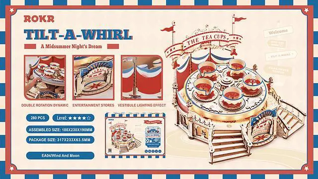 This Tilt-A-Whirl music box 3d puzzles for adults to build, containing pre-cut plywood sheets, 1 illustrated instructions with graphics, accessory tool and necessary spare parts, is a sophisticated combination of music box and amusement park. Press the red button and the chassis will drive five cups to rotate together, with nice melody "Wind and Moon" singing.