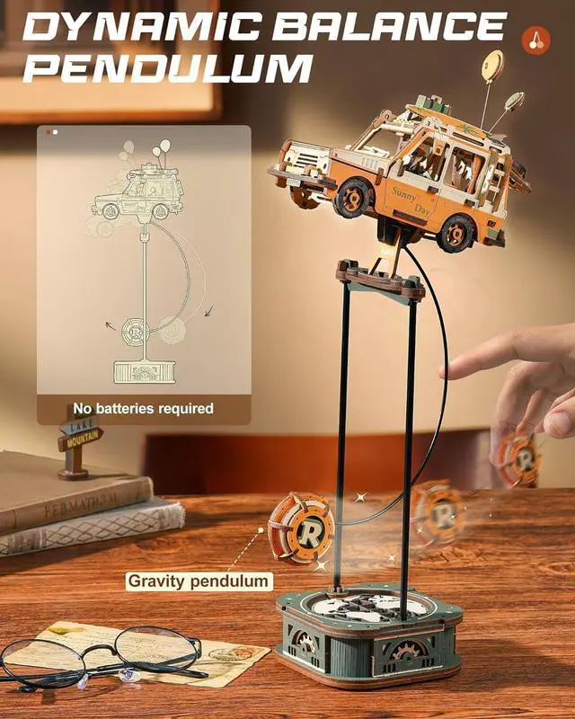 Dynamic Pendulum Physics This unique ROKR Road Tripper utilizes a clever mechanical structure and the principles of pendulum balance. Once assembled, a gentle push sends the car swinging back and forth along the track, showcasing the captivating beauty of dynamic physics. It's more than just a static model; it's an interactive ROKR 3D wooden puzzle that brings endless fun and wonder.