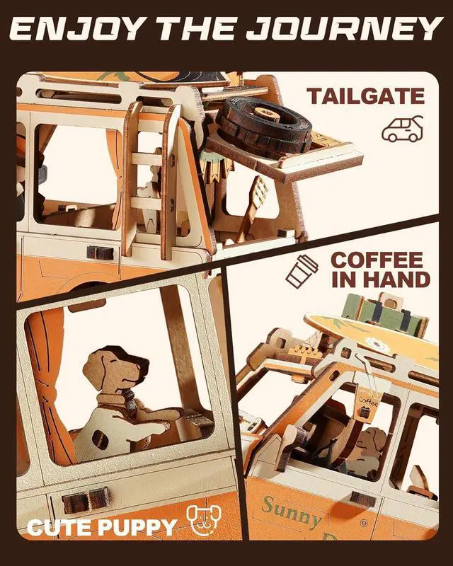 ROKR Road Tripper As an exquisite 3D wooden puzzle, the MCD03 stands out with its unique road trip theme and vintage design. The fine details not only capture the fun and adventurous spirit of travel but also create a delightful three-dimensional model. This ROKR puzzle is a visually stunning piece that adds a unique personality and dynamic flair to any room.