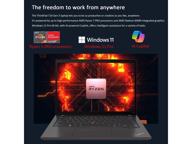 The ThinkPad T14 Gen 3 laptop with MIL-STD 810G Military Grade certification, equipped with blazing-fast LPDDR5-6400MHz RAM and Ethernet (RJ-45) port, it helps you to breeze through any task. What's more, this business laptop's weight starts at 3.10lbs so it can accompany you everywhere. AMD Ryzen 5 PRO 6650U Processor (6 Cores 12 Threads, base clock speed 2.9GHz, max turbo to 4.5GHz, 16MB L3 Cache); 16 GB LPDDR5-6400MHz (Soldered) memory, 1TB PCIe M.2 SSD.