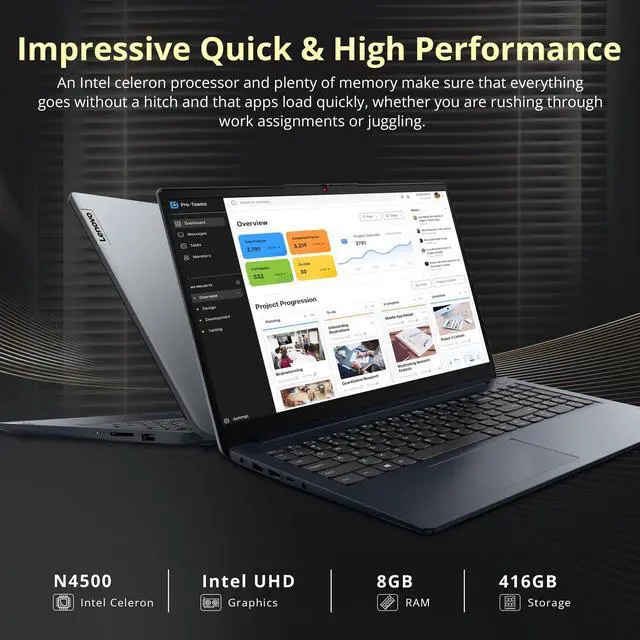 Intel Celeron N4500 ProcessorSmooth performance for daily computing needs, from web browsing to document editing and light multitasking. Intel UHD GraphicsEnjoy solid image quality that brings your everyday content to life with vibrant colors and sharp details.