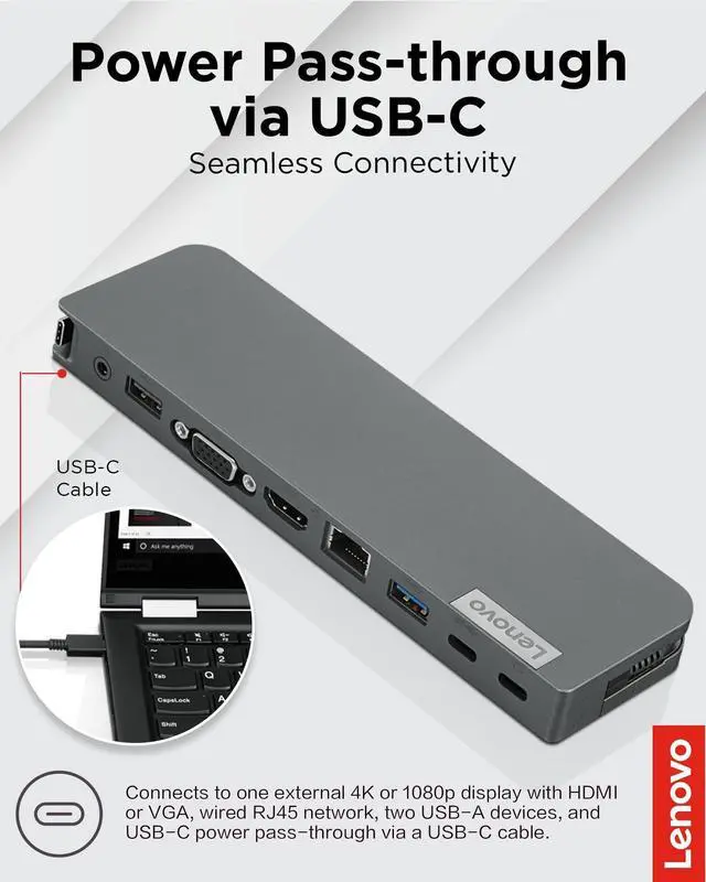 Unlock Your Potential with a Versatile Mini Dock; Lenovo recognizes the diversity of modern business computing needs, spanning different PC models and brands. To simplify this, the Lenovo USB-C Mini Dock offers compatibility not only with Lenovo notebooks but also with those from HP and Dell.
