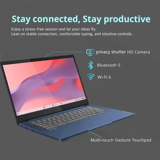 Google Chrome OSGoogle Chromebook is a computer for the way the modern world works, with thousands of appsIt is secure, fast, up-to-date, versatile and simple. 14" FHD multitouchscreenThe 1920 x 1080 resolution 300nits display 100%sRGB boasts impressive color and clarity. IPS technology for wide viewing angles. Energy-efficient LED backlight. 8Core MediaTek Kompanio 520 mobile processor8core for HD-quality computing. 4GB system memory for basic multitaskingAdequate high-bandwidth RAM to smoothly run multiple applications and browser tabs all at once. 64GB eMMC flash memoryThis ultracompact memory system is ideal for mobile devices and applications, providing enhanced storage capabilities, streamlined data management, quick boot-up times and support for high-definition video playback.