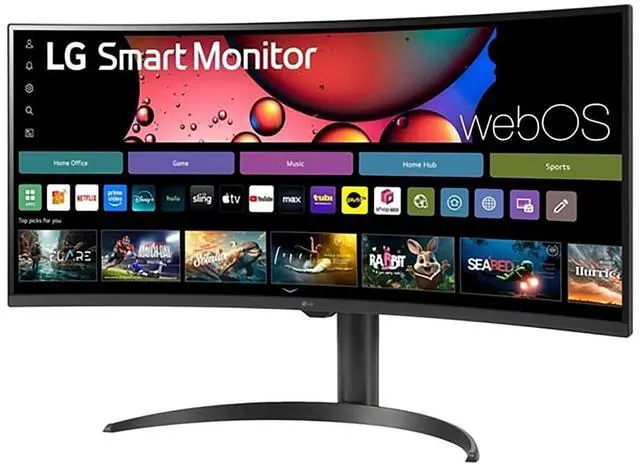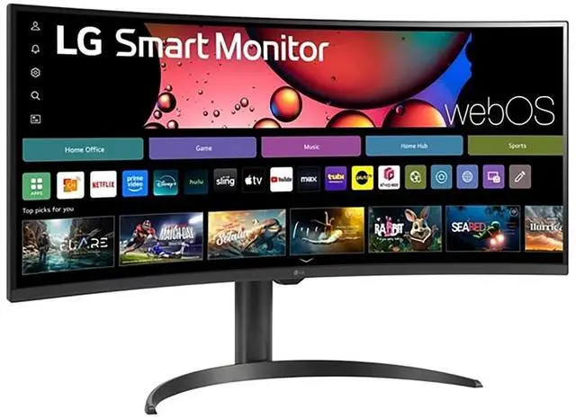 Adjustable StandProduct Features: Work Smart, Play Smart on a 21:9 Smart ScreenLG Smart Monitor is designed for multitasking while you work, play and watch. Connect the 34 21:9 curved display to a laptop, desktop or gaming console to immerse yourself in your work or games. Or, with the built-in LG webOS, you can watch favorite shows from your favorite streaming apps. Your Favorite Streaming ServicesThanks to webOS23, find your favorites fast with built-in access to Netflix, Prime Video, the Apple TV app, Disney+, HBO Max and instant access to over 300+ free LG Channels with everything from comedy to movies to sports. 34" Ultra Wide 21:9 Panoramic CinemaThis 34" ultrawide QHD (3440x1440) with a 21:9 aspect ratio offers a 34% wider view than a 16:9 display. And the monitor's sweeping 1800R curve envelops you as if you were at the movies. Includes an LG Magic RemoteJust say what you want with the included LG Magic remote. The Magic Remote easily navigates all your favorite on-screen content. Through the Magic Remote, you can even control and play your favorite content by voice command. Bold Color On A 34" Screen? Immerse yourself in a world of brilliant color from HDR10 that helps enhance picture quality and up to 99% sRGB color gamut expression to make games visually pop.