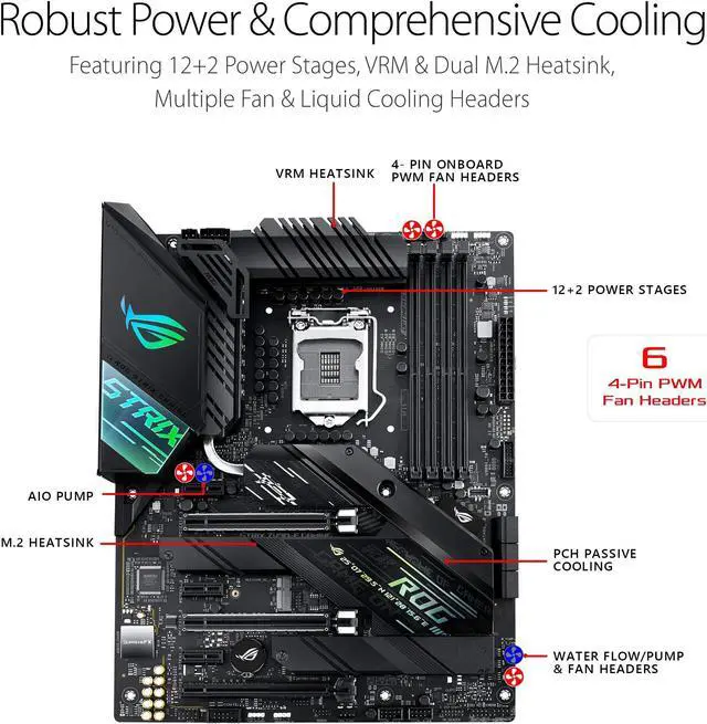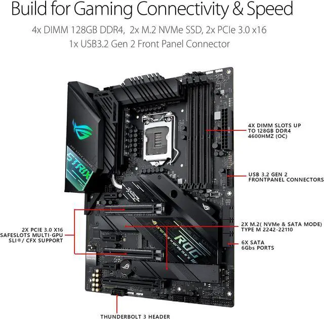 The ROG Strix Z490-F Gaming motherboard is designed to cope with the demands of 10th Generation Intel (r) Core (tm) processors, with boosted power delivery and an optimized cooling design providing more surface area for heat dissipation. ROG Strix Z490-F Gaming features AI enhancements and intuitive dashboards to help you overclock and tweak various parameters easily