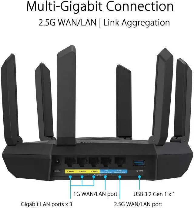 Explore ultimate technology with the ASUS RT-AXE7800 tri-band WiFi 6E router. Its breakthrough performance of up to 7800 Mbps WiFi speed can meet and exceed your internet needs, with comprehensive network protection provided by advanced ASUS security tech. Gear up for ultrafast connectivity!