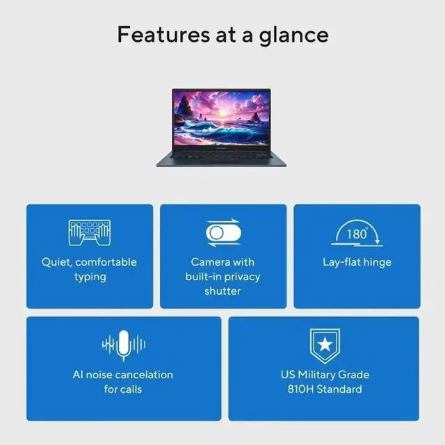 Secure ProductivityEngineered for productivity, this device features a 720p Privacy-Shutter Webcam, MIL-STD-810H & AI Noise Cancellation. Enjoy fast connectivity (Wi-Fi/Bluetooth) & Rapid Charging (60%