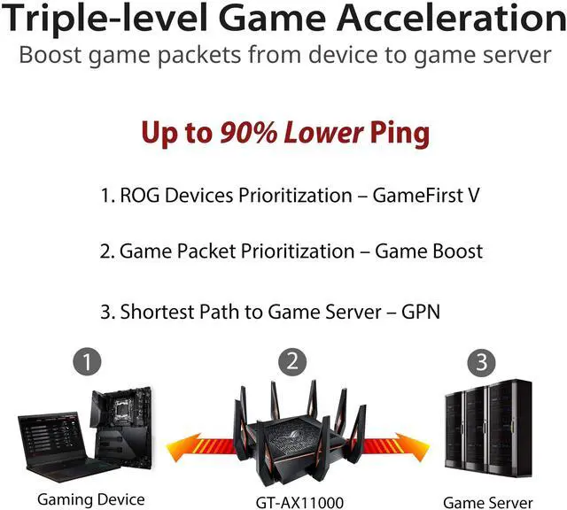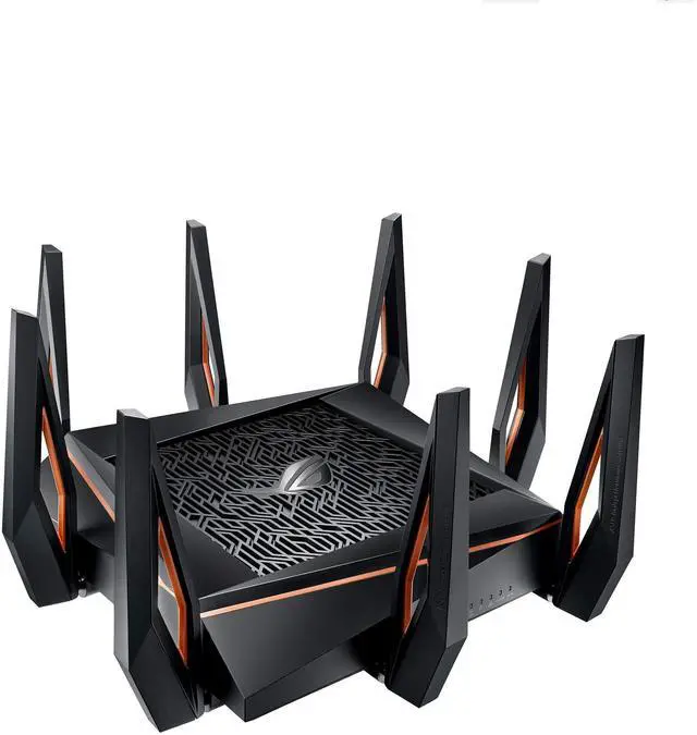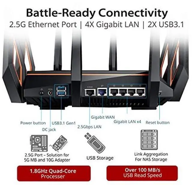 AX11000 Tri-band WiFi Gaming Router -World #39; #39; s first 10 Gigabit Wi-Fi router with quad-core processor, 2.5G gaming port, DFS band, WTFast, Adaptive QoS, AiMesh for mesh wifi system and AiProtection network security Triple-level Game Acceleration - Accelerate game traffic every step of the way - from device to game server. Battle-ready-hardware - 1.8GH z quad-core CPU and 2.5GB ase -T port for ultimate performance. Front-line Network Security - Neutralize internet threats before they hit your network. Better Partner with Mesh System - Compatible with ASUS AiMesh Wi-Fi system for seamless whole-home coverage.