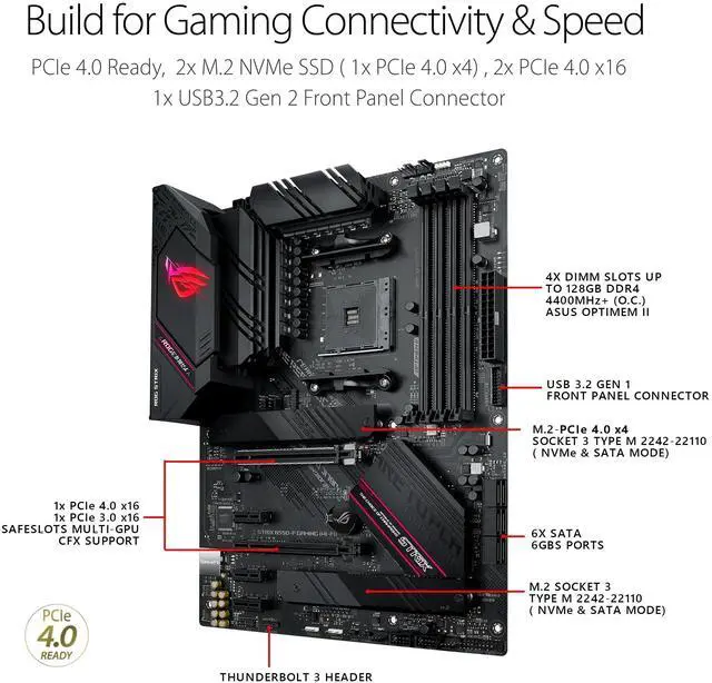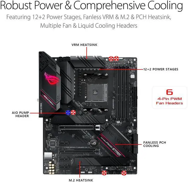 Experience next-level performance and connectivity with the Asus ROG STRIX B550-F GAMING WIFI II, featuring PCIe 4.0, WiFi 6E and 2.5G b Ethernet. Robust power and effective cooling make the ROG Strix B550-F Gaming (WiFi 6) the perfect partner for 3rd Gen AMD Ryzen CPUs. Futuristic aesthetics, intuitive software, and a reliable Stack Cool 3+ design put your build in the winners circle.