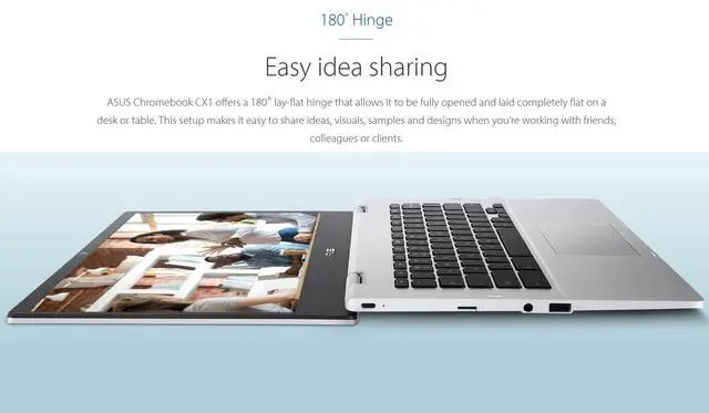 Tough enough to take anywhereWith structural reinforcements to boost chassis strength, ASUS Chromebook CX1 is solidly built and provides durability for all your travels. It also meets next-level and industry-leading MIL-STD 810H3 US military tests, which are more rigorous and demanding than ever before. Additionally, the device undergoes stringent in-house testing including panel-pressure, shock and drop tests for ensuring maximal toughness, so you dont have to worry about everyday knocks and bumps. Easy idea sharingASUS Chromebook CX1 offers a 180 lay-flat hinge that allows it to be fully opened and laid completely flat on a desk or table.