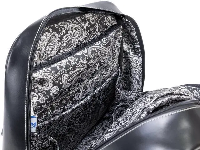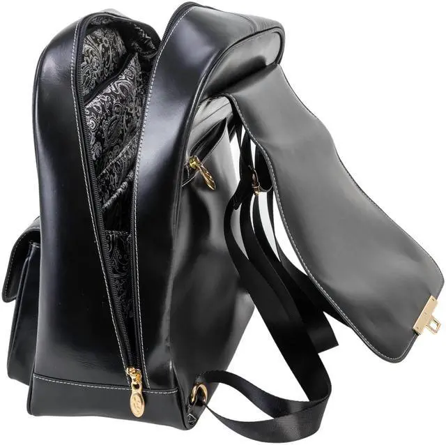 Front pocket with clasp turn closure, front flap over with clasp turn closure, front slip pocket, front zipper pocket. Main compartment with wide opening, ability to unzip all the way down on each side. Interior laptop pocket and tablet pocket. Interior zipper pocket. Two slip pockets for power cords, plugs and accessories. Zippers to main compartment can be locked. Fully lined interior. Gold finish hardware. Adjustable straps. Back zipper pocket. Handle hook for carrying or hanging.
