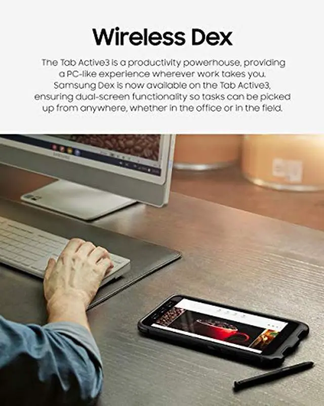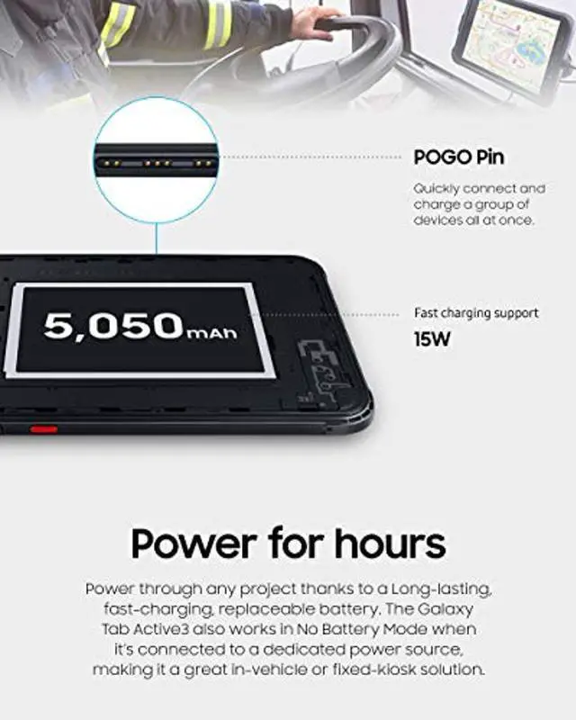 The tough and dependable Galaxy Tab Active3 tablet will help you tackle any challenge with ruggedized features and intuitive technology. Harsh environments are no longer a reason to not take advantage of the latest digital workflow tools. The Galaxy Tab Active3 is MIL-STD-810G and IP68-certified, so it's tough enough to withstand drops, shocks and outdoor environments, rain or shine. It's ideal for industries like transportation, manufacturing, field service, and public safety. Conduct crucial on-premises analysis, update work orders, count inventory, and file field reports complete with photos and videos, all with an intuitive interface on a reliable device.
