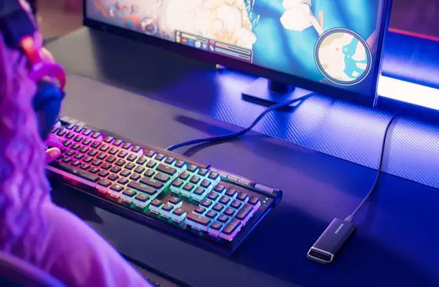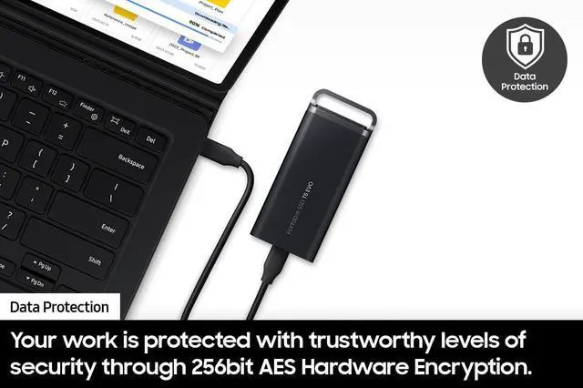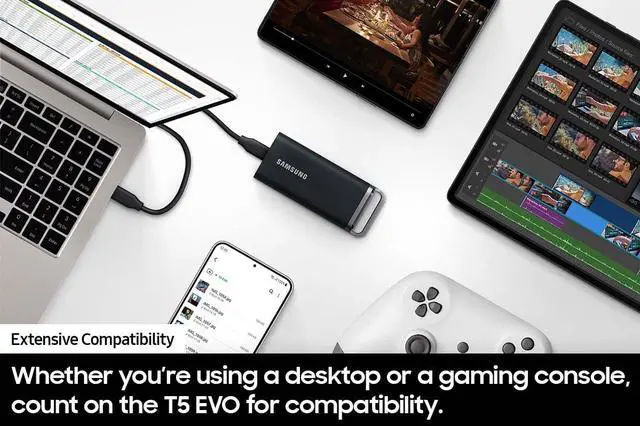We went big and made it portable. It's the T5 EVO--an ideal choice for gamers and content creators. This SSD is engineered to handle large file transfers while still small and nimble enough to take along on all your adventures. *Based on a free fall shock test conducted under controlled conditions. **Host device compatibility may vary.