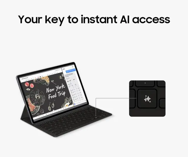 Feature availability and functionality may vary depending on certain apps, content, and device settings. 5Products sold separately. 6Wireless Keyboard Sharing is supported on Galaxy smartphones running One UI 3.1 or above and Galaxy tablets connected to the Book Cover Keyboard - AI Key via POGO. To enable Wireless Keyboard Sharing, both devices must be logged in to the same Samsung account. Up to 3 mobile devices can be connected for Wireless Keyboard Sharing. 7Compatible with Galaxy Tab S10+ (sold separately). 8Accesses Bixby and Gemini; requires internet connection and account login.