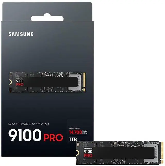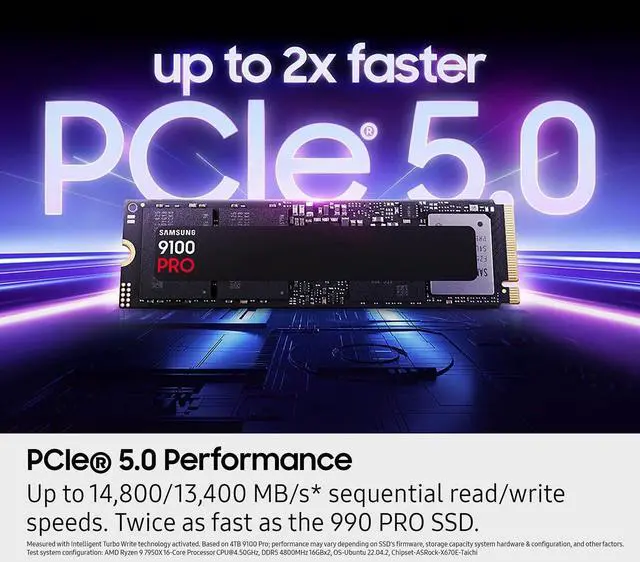 test system configuration: AMD Ryzen 97950X 16 Core Processor CPU@ 4.50GH z, DDR5 4800MHz 16GBx2, OS Ubuntu 22.04. 2, Chipset ASRock X670E Taichi. To maximize the perfor mance of the 9100 PRO SSD, please check whether your system supports PCIe 5.0 at the Intel or AMD website. **8TB capacity will be available later in 2025*990 PRO SSD Sequential Read/Write 1, 221/1, 255 MB/Watt, 9100 PRO SSD Sequential Read/Write 1, 822/1, 703MB /Watt based on test result of 2TB capacity model. Results vary by storage size. *Internet connection is required for authentification. Performance may vary based on the speed and quality of your Wi Fi connection.