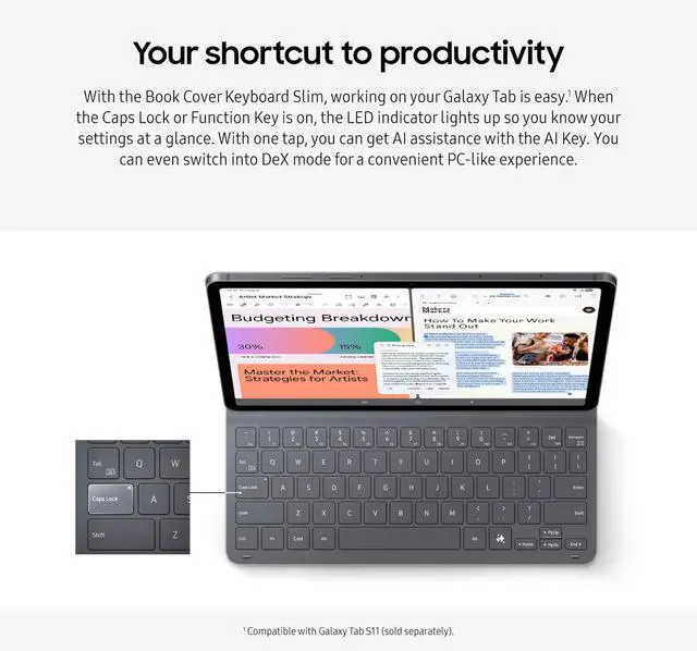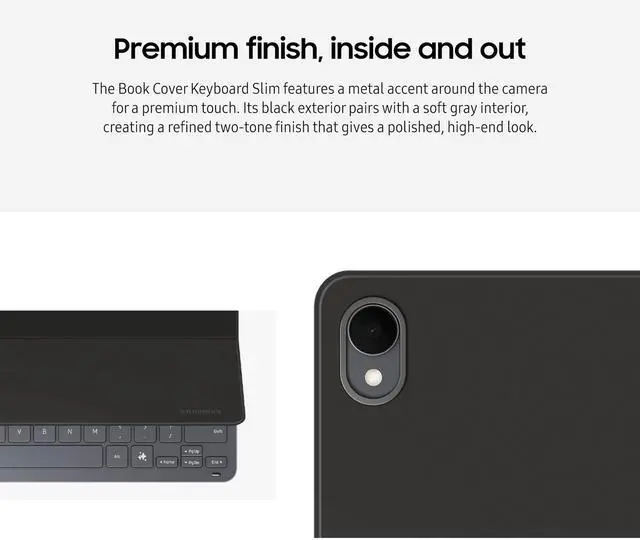 The Book Cover Keyboard Slim offers more than just protection it includes an integrated keyboard so that you can type comfortably anytime. Its slim and lightweight design keeps your tablet looking sleek while helping you stay productive on the go. Compatible with Galaxy Tab S11 (sold separately).