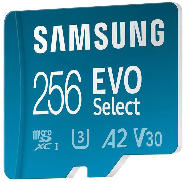 The Micro SD Memory Card EVO Select + Adapter gives you the freedom to do more. Store huge files, load games, and download the latest apps at lightning-fast speeds. Plus, its designed to be incredibly durable, resistant to water, high temperatures, magnets & more. All with the performance and reliability you expect from the worlds #1 flash memory brand. Speed and rating apply to 128GB, 256GB and 512GB cards. 64GB card is U1 rated, with transfer speeds of up to 130MB/s. Stated performance is achieved by using EVO Select Plus microSD cards with Samsung adapters.