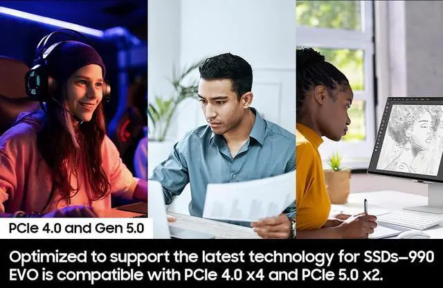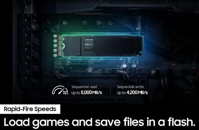 Test system configuration: AMD Ryzen9 7950x 16-Core Processor CPU@ 4.5GH z, DDR5 4800MHz 16GBx2 (PC5-38400), OS-Windows 11 Pro 64bit, Chipset - ASRock X670E Taichi. To maximize the performance of the 990 EVO, please check whether your system supports PCIe 4.0 or PCIe 5.0 at the Intel or AMD website. 970 EVO Plus Sequential Read/Write 636/550 MB/Watt, 990 EVO Sequential Read/Write 1, 020/933 MB/Watt based on test result of the 1TB capacity model.