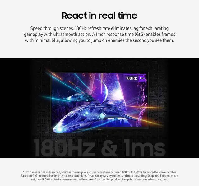 Features an ergonomic stand that makes it easy to swivel, tilt, and adjust the height of the monitor, plus Eye Saver mode, which enables more focused gaming with less eye strain, for total comfort even when playing for extended periods of time. "1ms" means one millisecond, which is the range of avg. response time between 1.00 ms to 1.99 ms truncated to whole number. Based on GtG measured under internal test conditions. Results may vary by content and monitor settings (requires Extreme mode' setting). GtG (Gray to Gray) measures the time taken for a monitor pixel to change from one gray value to another.