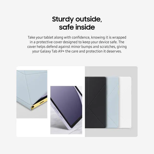 Protect your Galaxy Tab A9+ with a cover that's both versatile and stylish*. Not only does it help protect from everyday wear and tear, but it also allows for quick transitions between portrait and landscape modes, providing an unbeatable viewing experience. Choose your favorite color and just flip, stand, enjoy. *Compatible with Galaxy Tab A9+ (sold separately).