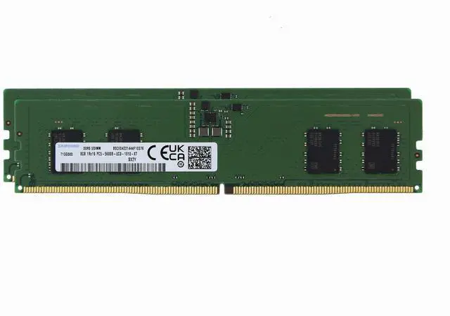 Dual 8GB RAM Module; DDR5 UDIMM 288 Pin; Speeds up to 5600MHz PC5-44800 (PC5-5600B) ^^ NON-ECC Unbuffered; 1Rx16 - Single Rank x16; JEDEC DDR5 standard 1.1V ^^ Genuine Samsung DDR5 Memory RAM ^^ Product may be an equivalent Samsung part number identical in specifications and performance ^^ Compatible for select DDR5 Desktops and All-in-One (AIO) computer systems