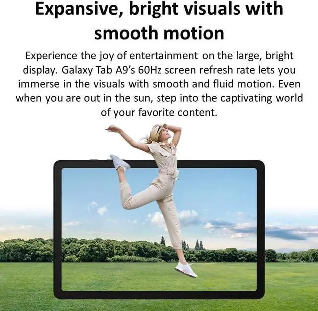 Plus, the built-in 64GB storage saves all your hi-res videos, photos and files. You can expand the storage with a microSD card up to 1TB. Store more of what you love and delete less. Split the screen into two. Multiply your productivity - Conquer multiple tasks at once. With Galaxy Tab A9, you can sketch out architectural plans and choose captivating visuals and video chat up to two apps all on one screen without ever closing a window. Surround yourself with rich audio - Take a deep dive into a rich soundscape with speakers that provide an enveloping audio experience.
