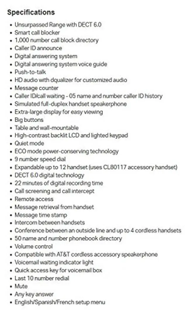 See, hear and make calls with ease with the AT&T CL82357 DECT 6.0 Expandable cordless phone with Smart Call Blocker and Unsurpassed Range. With this system, you can say goodbye to unwanted calls waking you up in the middle of the night or tying up the phone line. Robocalls are automatically blocked from ever ringing througheven the first time. You can also permanently blacklist any number you want with one touch. The AT&T CL82357 is a reliable cordless system that brings you long range, HD audio and extra features like caller ID announce and push-to-talk for effortless calls from any room in your home.