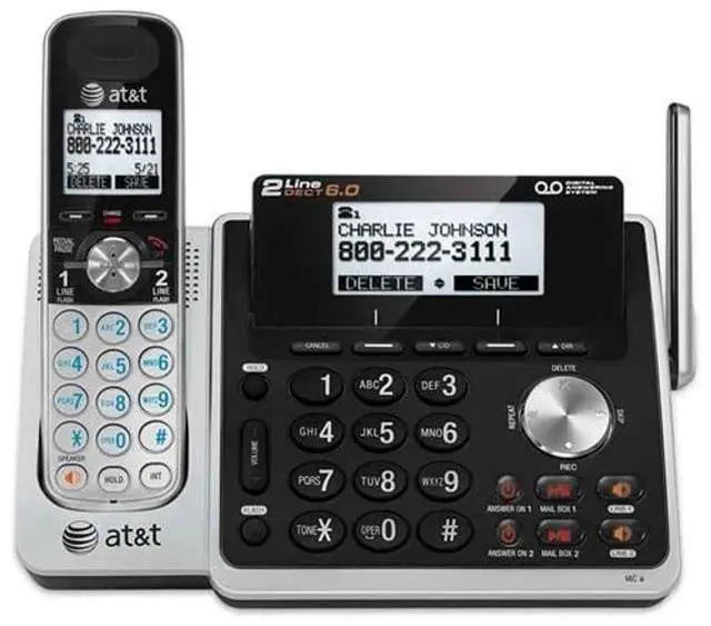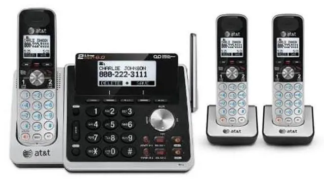 TL88002 Features: DECT 6.0 Technology ( 1.9GH z) Interference-Free & Wide Range 30% more Battery life 2-Line Operation Dual Caller ID / Call Waiting Expandable Up To 12 Handsets 14 Minute Digital Answering System- Time and Day Stamp- Call Screening / Intercept Handset Message Access- Remote Access Extra Large LCD Display w/ Adjustable Tilt Dual Speakerphone (Base & Handset) Automatic Gain Control (AGC) Backlit Keypad Dial Display 50 Station Name / Number Caller ID Memory 50 Station Phone Directory / Dialer Up To 4-Way Conferencing Handset to Base / Handset Intercom Last 20 Number Redial Hold Mute Trilingual Menu Support (English / Spanish / French)AT&T TL88102 + (2)