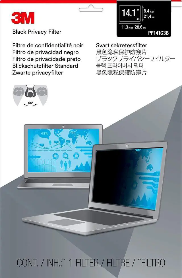 3M PF 14.0W Privacy Filter Black - For 14" WidescreenNotebook - 16:9 - Polymer, Plastic - Anti-glare - 1 Each Darkening privacy filter is designed for 14" wide-screen laptops to provide worry-free privacy wherever you work. Advanced microreplication technology creates an excellent viewing experience on your high-resolution display. Incredibly slim privacy filter offers amazing screen clarity and advanced visual privacy protection. Whether you're working in an open office floor plan, on a plane, on a train or at a coffee shop, viewers from either side of your laptop will see a darkened screen, helping keep your information secure and out of sight.
