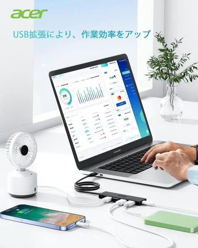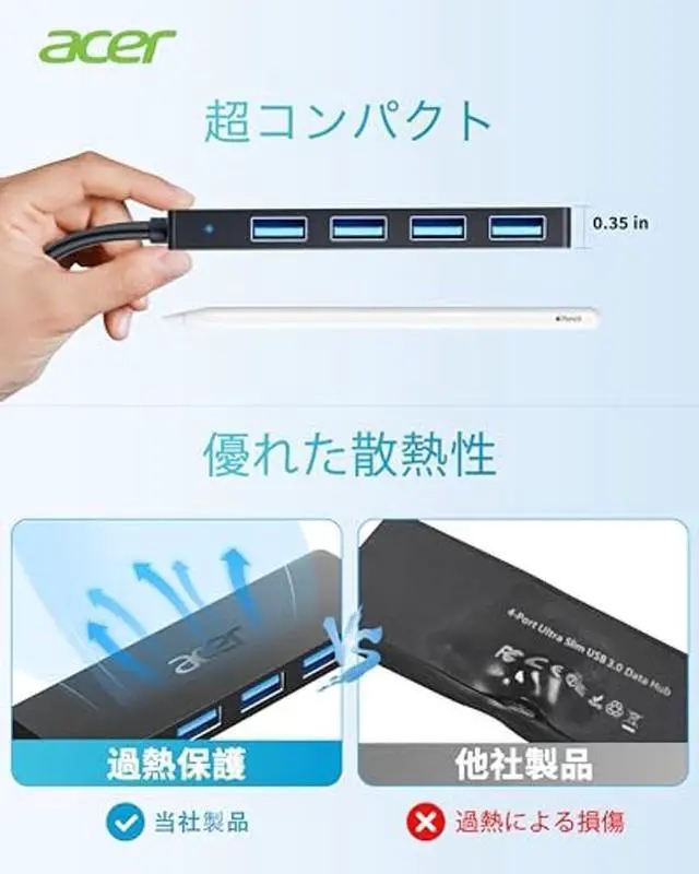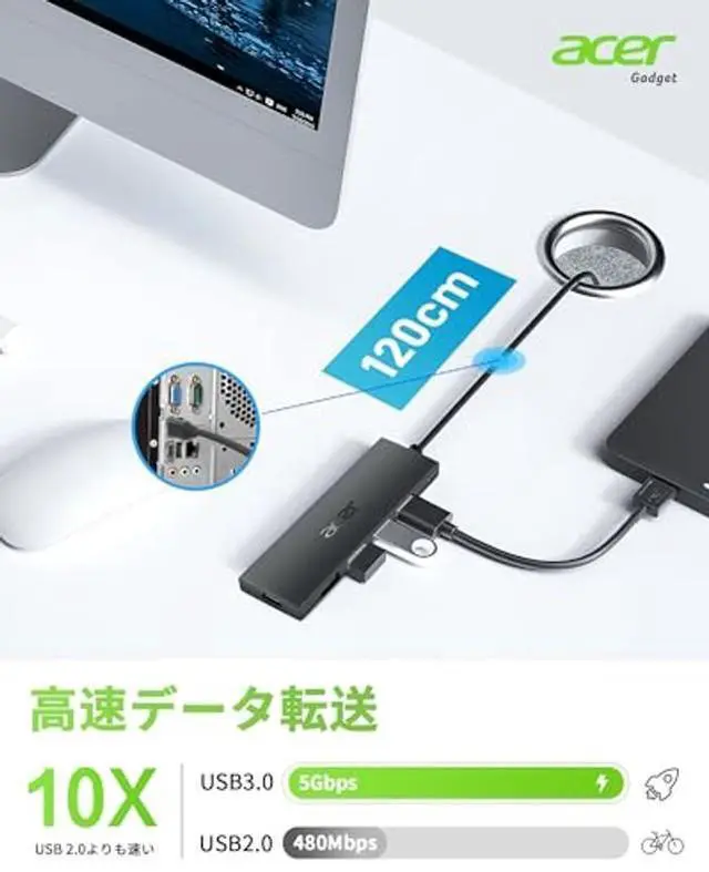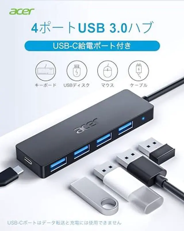 4 Ports USB 3.0 HubAcer USB C Hub offers a versatile solution, expanding your device with four additional USB 3.0 ports. Perfect for connecting USB peripherals like flash drives, mice, keyboards, and printers. ^^ 5Gbps Data TransferThe USBC splitter is designed with 4 USB C 3.0 data ports, you can transfer movies, photos, and files in seconds at speed up to 5Gbps. When connecting hard drives to transfer files, you need to power the hub through the 5V USB C port to ensure stable and fast data transmission ^^ Excellent Technical DesignBuild-in advanced GL3510 chip with good thermal design, keeping your devices and data safe.