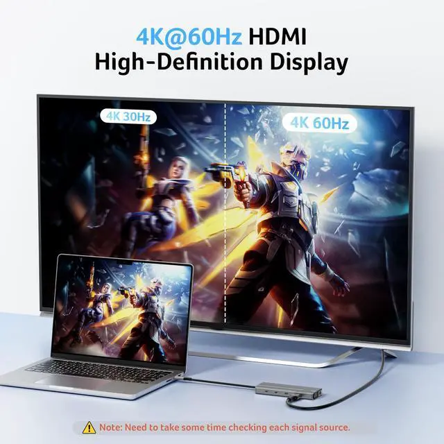 Note: Please connect the power supply with the PD port with 100W charger for optimal performance. ^^ Stunning 4K@60Hz DisplayWhen used with VGA, the USB C to HDMI adapter hub can achieve dual-screen display up to 1080P@60Hz, supporting mirror mode (A-AA) and extended mode (A-BB). It unlocks ultra-high definition 4K@60Hz quality, delivering lifelike clarity for movies, lag-free gameplay, and crystal-clear video conferences.