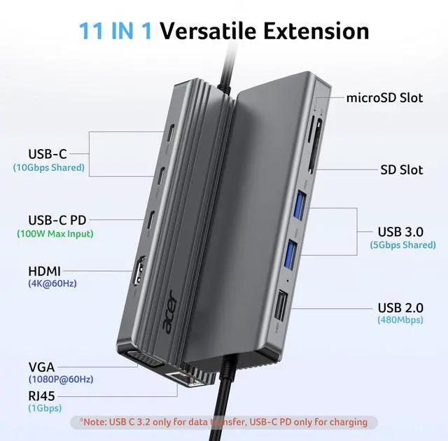 11-in-1 Versatile USB C AdapterBoost productivity with this USB C 3.2 hub, featuring 4K@60Hz HDMI, 1080P VGA, 2x USB-C (10Gbps), 2x USB-A (5Gbps), USB 2.0, 100W PD charging, 1Gbps ethernet and SD/Micro SD slots (104Mbps). This USBC hub perfect for work from home, office or travel.