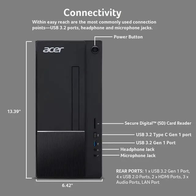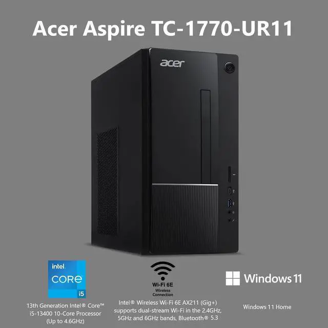 Make everyday easlier with the high-performance Aspire TC. From basic computing to multimedia entertainment, its a robust hub for your every computing need. Snap between tasks with the latest 13th Gen Intel Core i5 processor and 8GB of memory, this sophisticated PC delivers plenty of speed, power and storage so you can play, create, do more! Easily expandable and with remarkable performance, the Aspire TC Series is the perfect partner when it comes to demanding tasks like video editing and compiling photo albums. And it offers front-panel media access so you can easily connect to your digital devices.