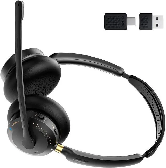[Dual Connection: Bluetooth 5.3 + 2.4Ghz USB Dongle] Effortlessly switch between devices with stable Bluetooth 5.3 and a plug-and-play 2.4GHz USB dongle. Double-click the power button to toggle between bluetooth headset mode and USB mode. This wireless headset ensures seamless compatibility with laptops, desktops, phones, and tabletsoffering flexibility for any workflow.