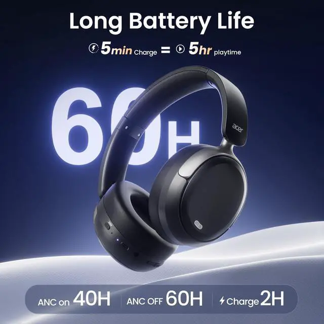 Battery Life: Enjoy up to 60 hours of non-stop playtime with ANC off (40 hours with ANC on). A quick 2-hour charge via the USB-C port powers you up for days of use.