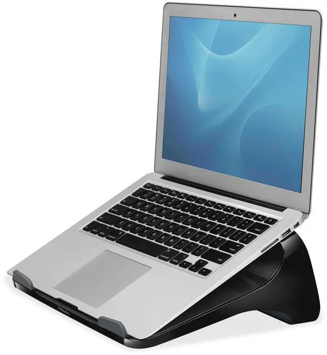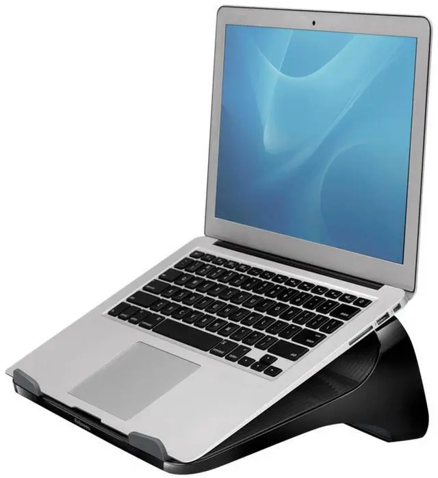 Innovative design elevates your laptop for enhanced viewing comfort while working at your desk. Built-in curved design helps keep laptop cool. Front bumpers hold all laptops up to 17" securely in place. 25 Degree incline provides a comfortable viewing height. Modern design accents any workspace - whether at home or in the office. Look for coordinating I-Spire Series products from Fellowes.