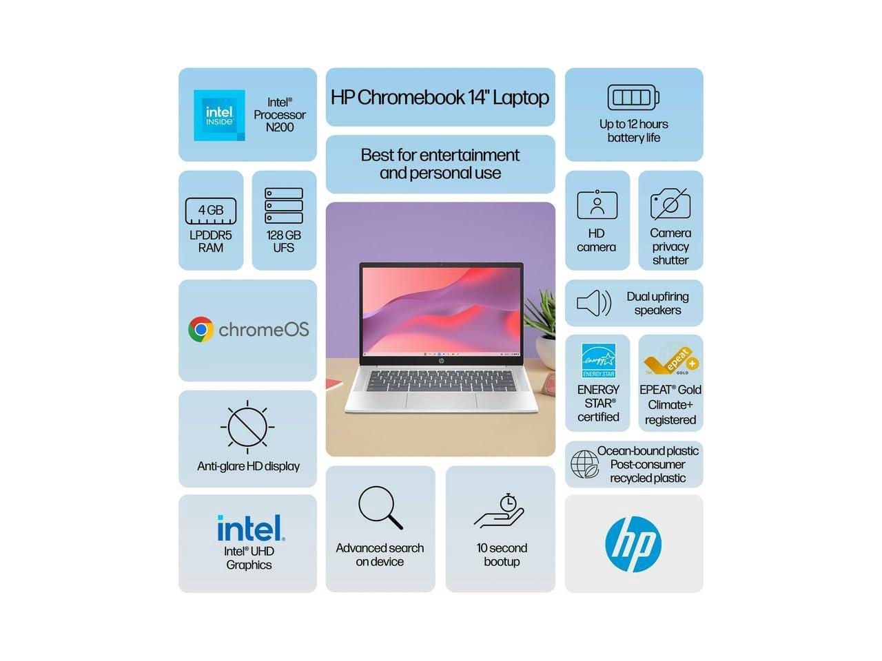 HP Chromebook 14" HD Laptop, Intel N200 Processor, 4GB LPDDR5 RAM, 128GB UFS, Chrome OS, Glacier Silver, Intel UHD Graphics, Bundle with TWE Mouse Pad