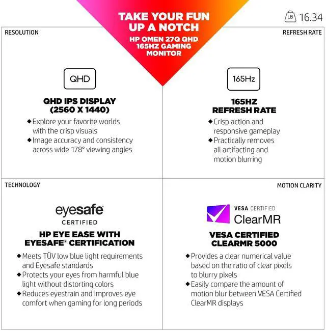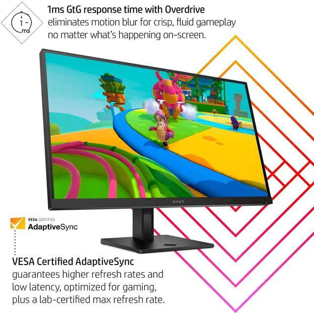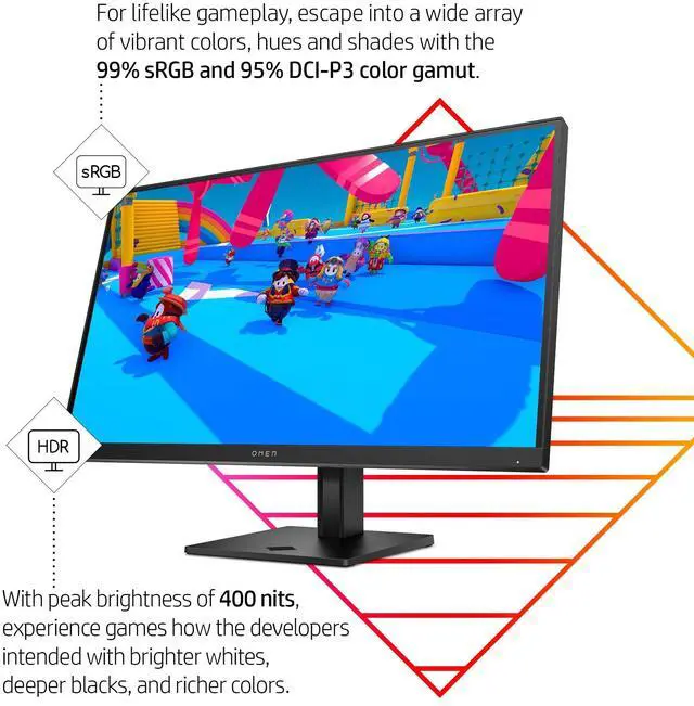 Take your fun up a notch with the OMEN 27q QHD 165Hz Gaming Monitor. Reach new possibilities with quick performance and vibrant color that lets you get lost in the game. This display has a sleek design and functions to look and feel great on your desk. This monitor comes with a power cord, DisplayPort 1.4 cable and a quick setup poster. Plus, this display's plastics contain 85% post-consumer recycled plastics to help reduce the raw materials we use. This monitor is protected by a 1-year HP limited warranty. Certain restrictions and exclusions apply.