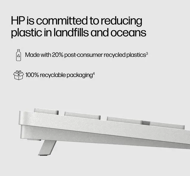The HP 970 Programmable Wireless Keyboard delivers the ultimate in cord-free flexibility with the ability to wirelessly connect two devices via Bluetooth 5.0 and one using the 2.4GH z USB-A receiver dongle, as well as easily switch between Windows and macOS devices using one button or pair peripherals to a Windows PC in just two steps using Microsoft Swift Pair. Stay in the zone longer and uninterrupted with a long-lasting rechargeable battery that delivers more than 6 months of battery life (2) and is easily rechargeable using a USB-C cable. And because it's made with 20% post-consumer recycled plastics (3), you can compute with confidence knowing you're doing your part for a cleaner planet.