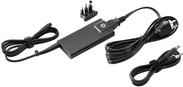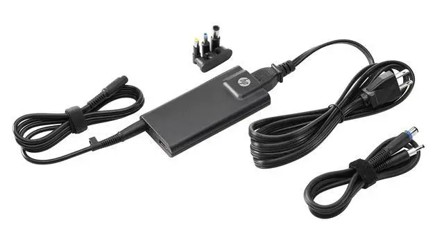 The HP 65W Slim AC Adapter includes multiple interchangeable tips all using a single detachable cable, HPs Smart-pin energy saving technology, optional USB connection, and the reassurance of HP certification.