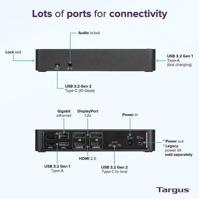 Expand your workstation and connect to virtually any laptop with the Universal USB-C DV4K Docking Station with 100W Power. ^^ Supports single and dual 4K UHD @ 60 Hz video via two DisplayPort 1.2 a ports or HDMI 2.0 ports ^^ Power Delivery 3.0 up to 100W for USB-C hosts ^^ Enjoy this docks combination of USB-A (4x USB 3.2 Gen 1 Type-A ports) and USB-C (1x 3.2 Gen 2 Type-C) ^^ The dock also includes a fast-charging port for charging your smartphone, tablet, or other devices.