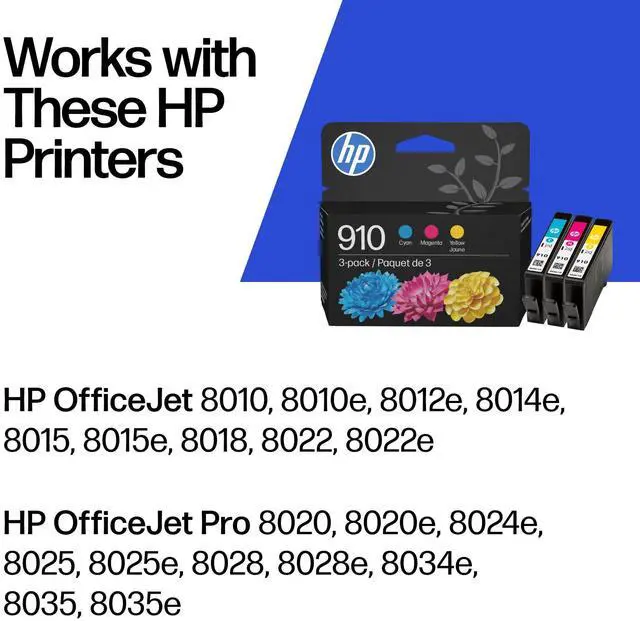 • HP 910 ink cartridges work with: HP OfficeJet 8035, 8028, 8025, 8022, 8020. HP 910 yield (approx.) per cartridge: 315 pages cyan, 315 pages magenta, 315 pages yellow.
