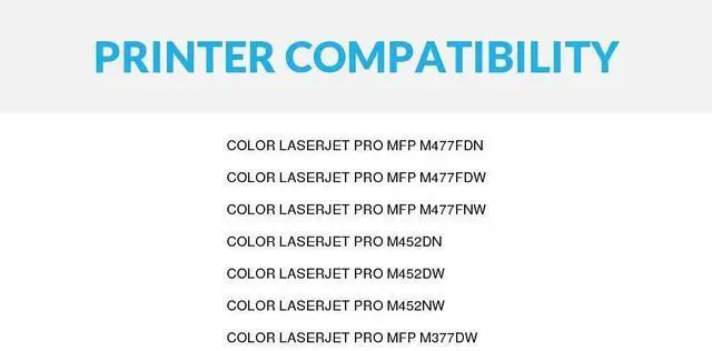 Package Inclusions: SPEEDYINKS Compatible Toner Cartridge Replacement for HP 410X High Yield (4-Pack, 1 Black, 1 Cyan, 1 Magenta, 1 Yellow) for use in Printer HP Color LaserJet Pro MFP M477fdn M477fdw M477fnw M452dn. We offer printer cartridges for hard-to-find printer models. Our cartridges are good for home, office or when you're running a business. Our products are put through a rigorous testing process where they are monitored for quality and reliability. Knowing the toner cartridge that works most efficiently with your printer model is important. Please note, retail packaging may vary and these cartridges will only work with printers purchased within the United States and Canada. The use of these compatible cartridges is not manufactured by HP.