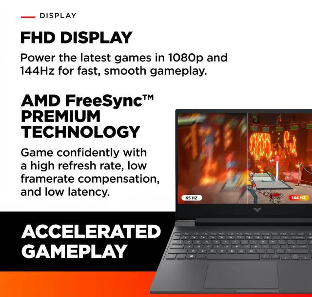 IPS panelNo matter where you stand, this screen delivers clear, vivid images with 178-degree wide-viewing angles, so everyone can get a great view. AMD FreeSync Premium TechnologyEvery gamer deserves perfectly smooth gameplay and peak performance. Game confidently with a high refresh rate, low framerate compensation, and low latency. HP Fast ChargeGo from 0 to 50% charge in approximately 30 minutes. Effortlessly connectedEnjoy faster speeds, improved performance and greater capacity with Wi-Fi 6 and Bluetooth 5.3 wireless card. HP Wide Vision HD CameraThe 88-degree, wide-angle field of view lets you video chat with the entire family or group of friends in crystal clear detail.