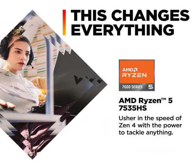 Get a fresh perspective with Windows 11From a rejuvenated Start menu, to new ways to connect to your favorite people, news, games, and contentWindows 11 is the place to think, express, and create in a natural way. AMD Ryzen 5 7535HSSpeed meets endurance in this gaming laptop powered by an AMD Ryzen processor. AMD Radeon RX 6550M Mobile graphicsThe powerful AMD Radeon RX 6550M graphics card, engineered with AMD RDNA 2 architecture and 4 GB of GDDR6 to double performance and accelerate 1080p game play. 144Hz FHD anti-glare displayReduce frustrating lag and image ghosting with a display that combines a 144Hz refresh rate and 1080p Full High-Definition resolution for smooth, crisp gameplay.