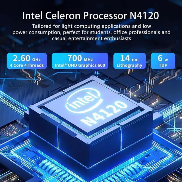 Graphics 600Processor: Intel Celeron N4120 (Base clock 1.10 GHz, up to 2.6 GHz burst frequency, 4 MB L2 cache, 4 cores, 4