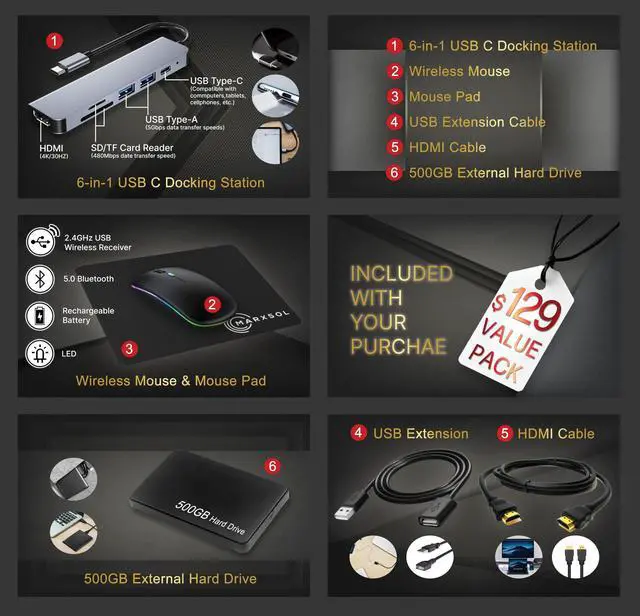 poundsAccessory: MarxsolAccessory (500GB External portable Driver +6-in-1 USB-C Docking Station Hub, HDMI cable, USB extension cable, mousepad, and wireless mouse)